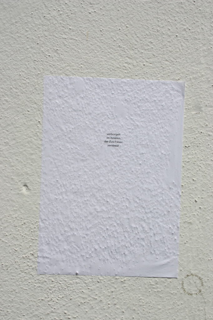 In meiner ‚Gmünder Arbeit‘ gab ich der Natur etwas Gold* zurück. Brachte es wieder in Fluß. Im Vorfeld durchlief ich die Stadt und ließ Texte als A4-Formate an Fassaden Pfeilern, Zäune und leerstehenden Objekten auftauchen, wo sie sich mit dem jeweiligen Ort verbanden. Die plakatierten Texte erfassten die Inhalte der Aktion – Natur, Aubeutung, Werte, das Zurückgeben, das Fließen usw. und gaben sie an die Vorbeigehenden weiter.