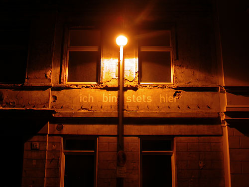 Auf die Fassade eines leerstehenden Hauses, entsprechend der Strassenlaterne, ‚ich bin stets hier‘ geschrieben.Gegenüber blickt die Nachbarin aus dem Fenster.