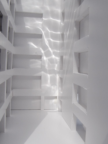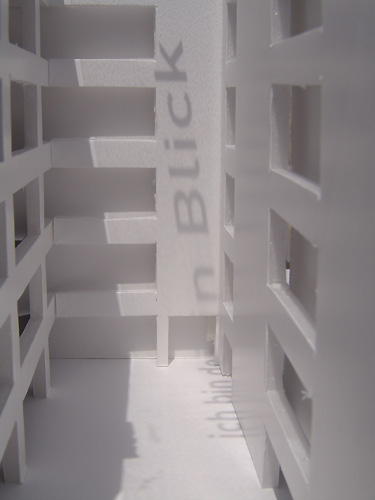 In sich ständig veränderndem Lichteinfall wird der Text auf die Wände, in die Flure und Flächen projiziert und jeder Standpunkt ergibt einen anderen Blick, zeigt andere Perspektiven und Ausschnitte.