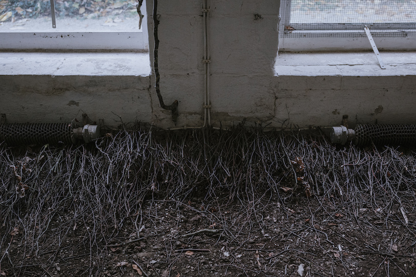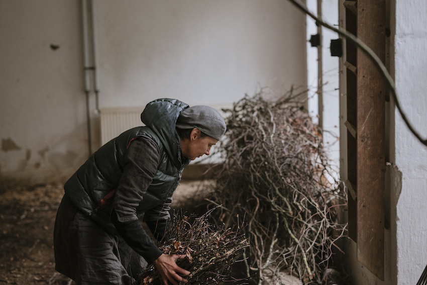 die Zweige, die ursprünglich einen geschützten Pavillon formen, bildeten mein Ausgangsmaterial für die Insallation, ergänzt durch die Früchte der gefällten Buche, Erde aus dem Schlossgarten, dem gerahmtenText ‚ich erinnere mich‘, Licht und Wärme.