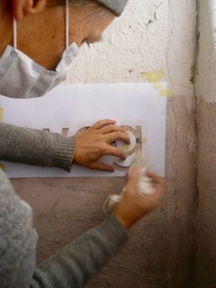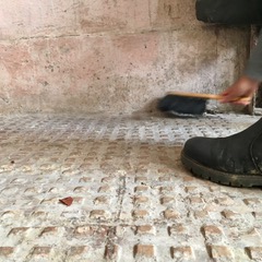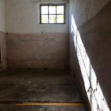 Arbeit in einem ehem. Hühnerstall. Ich goß dottergelbes Wachs in die Abflußrinne des Stalles und schrieb an eine Wand unterhalb des Fensters mit eingefegtem und gemörstem Staub ‚ich gehe darüber hinweg‘.