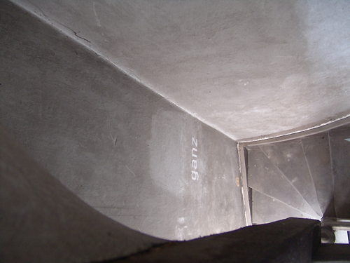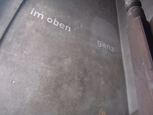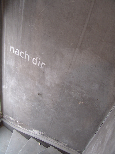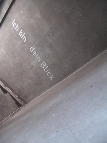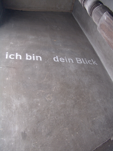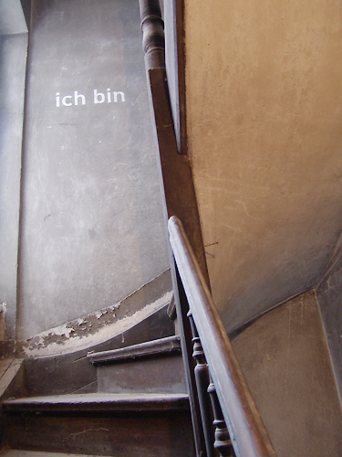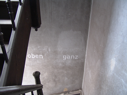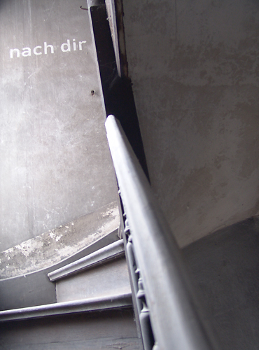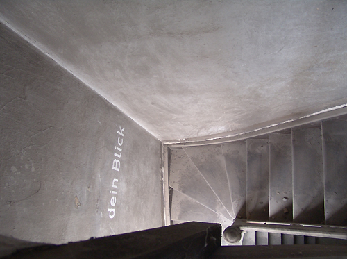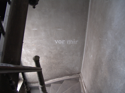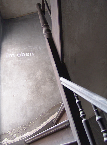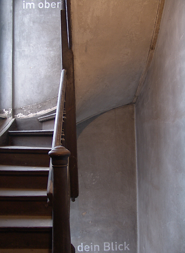 Text über vier Zwischenebenen – auf beinahe jeder Stufe ergeben sich entsprechend dem eigenen Geh- und Standort weitere Texte und Textzusammenhänge.Auf Wohnungebene sind jeweils die darüberliegende und darunterliegende Textebene gleichzeitig zu sehen.